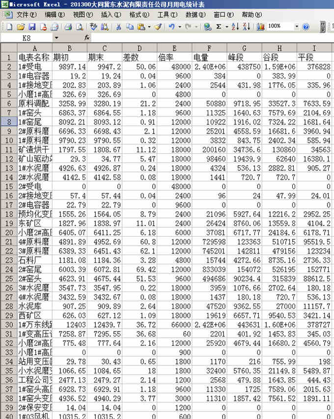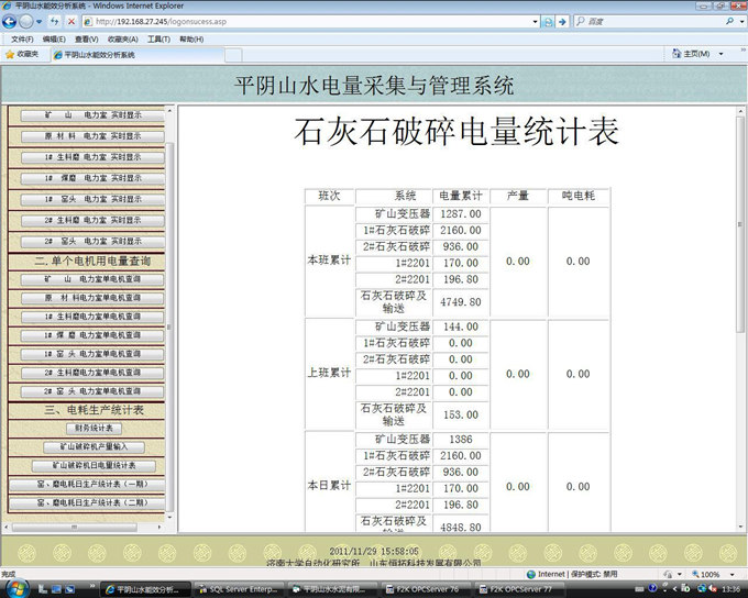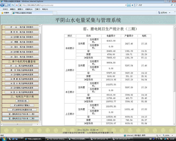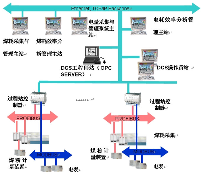 该子系统电耗数据(电量、负荷、电压、电流等)的实时采集由智能电表完成,煤耗数据的实时采集则由原DCS系统的喷煤称流量数据进行累加获取,并通过盘库实现校正。该类基础数据通过系统网络上传到主站管理系统,实现主要能耗数据的实时采集与监视。