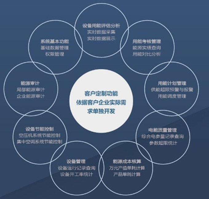 企业能源管理中心是多层次、模块化、全局性的综合管理系统。其中包括9大基本功能模块及用户定制功能模块。