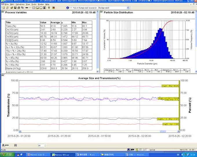 经过20多天的数据采集,2015年8月24日开始投用水泥粒度自动控制软件,根据<45微米粒度自动控制选粉机及后排风机,效果良好,在确保质量合格的基础上,台时提高了5-10吨。