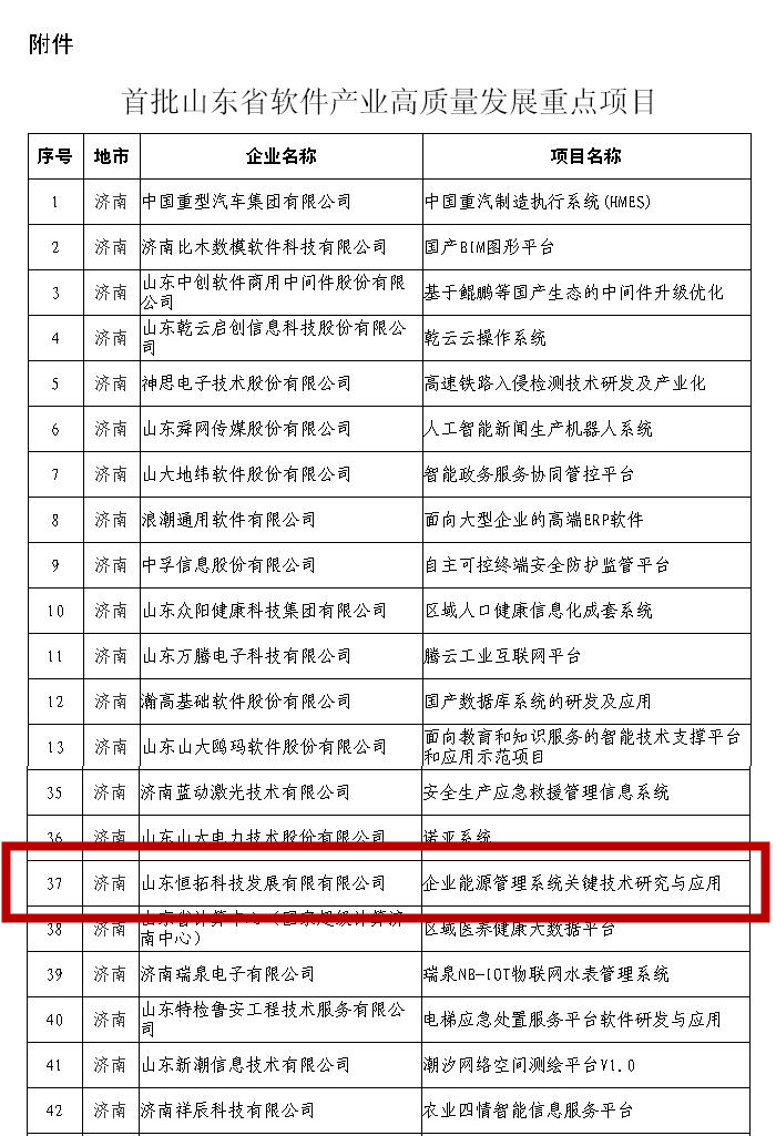 山东恒拓科技发展公司的企业能源管理系统关键技术研究与应用,荣幸入选首批山东省软件产业高质量发展重点项目名单。本次入选是对我司软件技术创新工作的认可,公司将以此为契机,进一步加强产学研合作、提高企业创新能力、加快新旧动能转换,争取取得更多优秀的软件技术创新成果。
