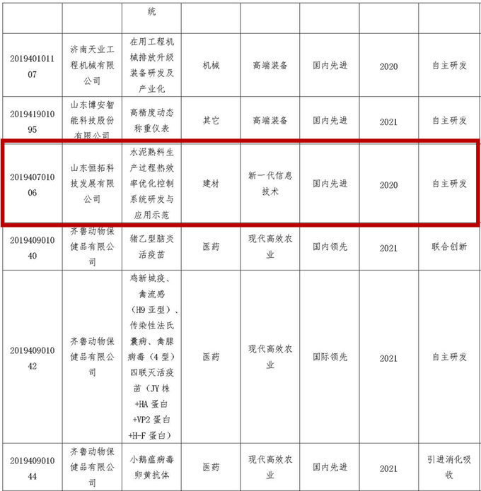 进一步加快企业技术创新步伐,加快新产品研发与产业化,以“四新”推动“四化”,推动全省新旧动能转换,经各市和省直有关部门推荐和专家论证,近日,山东省工信厅公布了2019年第四批技术创新项目计划入选企业及项目名单,我司自主研发的水泥熟料生产过程热效率优化控制系统研发与应用示范项目成功入围,该项目技术水平达到国内先进水平。